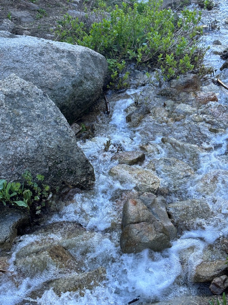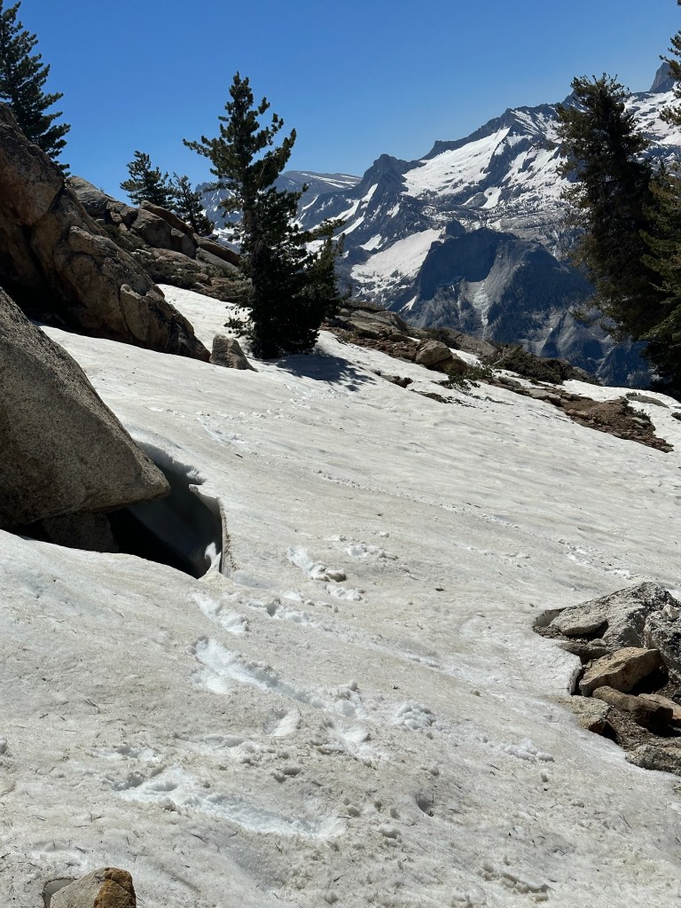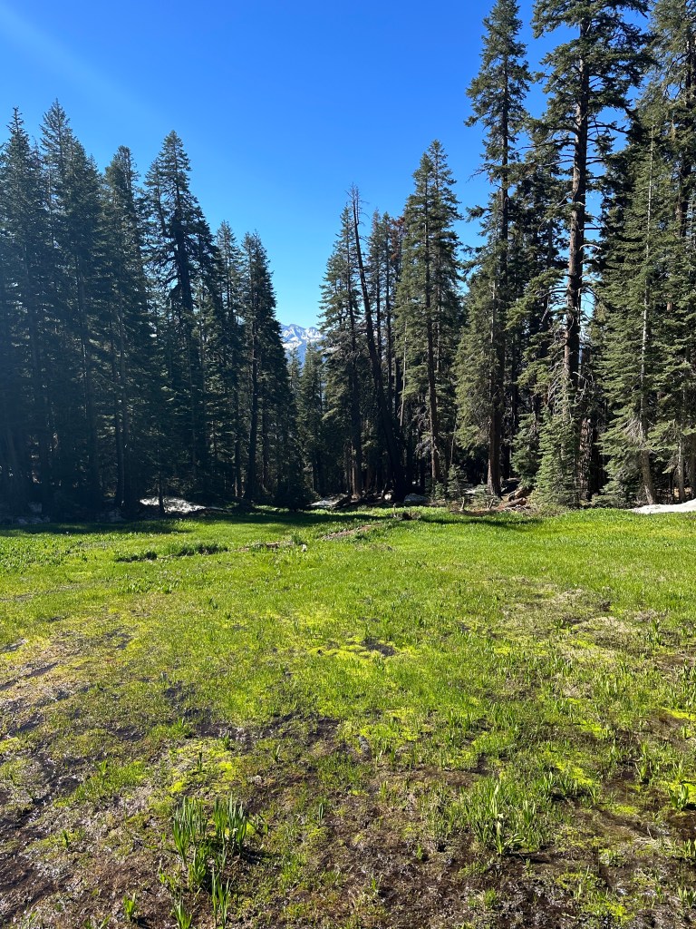 The first couple of miles were through forest and meadows with plenty of wildflowers. I also came across many streams cutting through the trail. Evidence of the heavy winter was plentiful with downed trees over the trail frequently. I also started to see snow off the sides of the trail, and had to traverse over a couple banks of snow on the trail. This was a little worrisome considering I was only a couple of miles in and had the majority of elevation gain to go. I didn’t see anyone my entire way up other than a backpacker camp off the side of the trail. But once I hit the backpacker camp I caught my first glimpse of some amazing views.