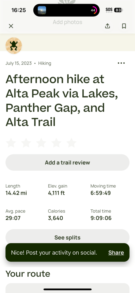 While I was on top of Morrow Rock, I was able to find a place with phone service and decided to look up hikes to do in Sequoia National Park (still had no idea what I was going to do at this point). I pulled out my trusty AllTrails and started looking up hikes. I found this hike I had never heard of called “Alta Peak” and it had great reviews with awesome views. However, all the recent reviews (as of mid July 2023) said that there was still a lot of snow on the hike with portions of the trail completely obscured by snow.