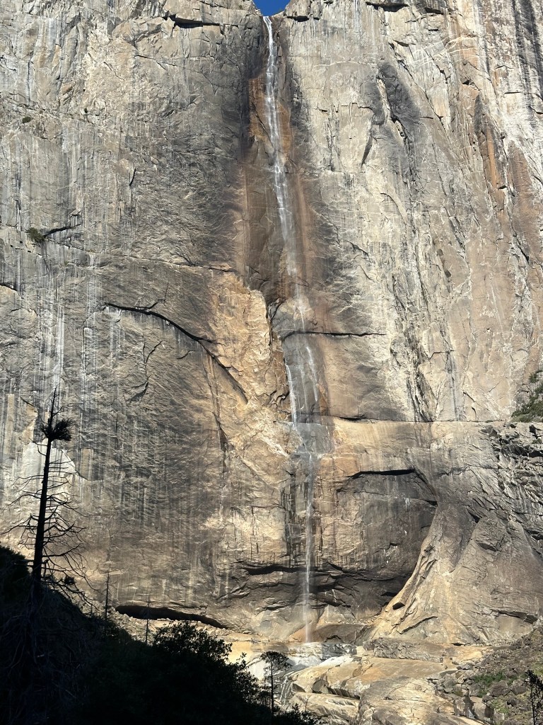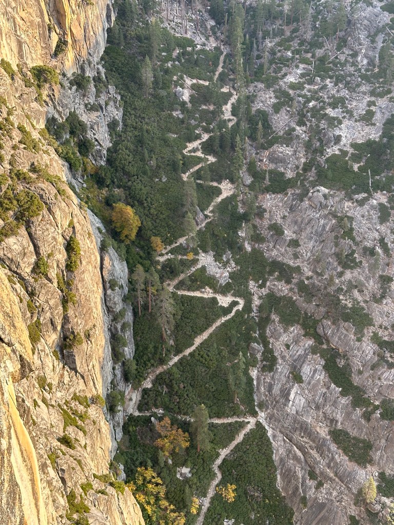 Ok, now that you have your permits and are ready to begin your hike, it’s time to start on the Upper Yosemite Falls trail that starts right by Camp 4. Park your car in the Yosemite Falls lot (it will be fine there overnight). The beginning part of this trail will be very tough, it’s not for the faint of heart. The path to falls is about 3,000 ft of elevation gain in 3 miles. Add onto that a 40+lb pack and you will definitely be feeling it. DO NOT attempt this during the heat of the day. Below is a picture of what just a few of the switchbacks look like: