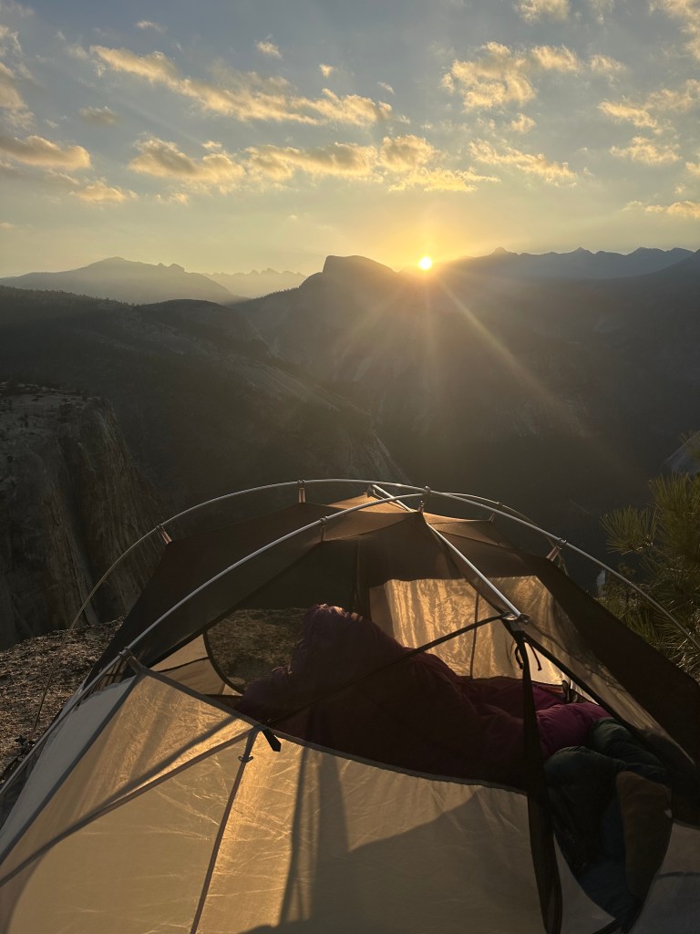 You’ll trek through the backcountry for 1-1/2 miles until you come out from the trees and see the immediate expansive view of the valley and Halfdome. I hiked down along the cliff’s edge until I found a great overlook of the falls. It was totally perfect. There was this fairly flat ledge I pitched my tent on and all I had to do was unzip the flap and I had a perfect uninterrupted view of Halfdome. I’m no huge fan of heights, so this was a little too close to the edge for comfort. But, I placed a few rocks along the edge so that I couldn’t roll off. This was the most incredible place I’ve ever camped and one of the best views I’ve seen in Yosemite by far. Not to mention the sunset and sunrise were absolutely incredible. The sun sets and leaves a beautiful pink reflection on Halfdome, and then it rises directly behind Halfdome.